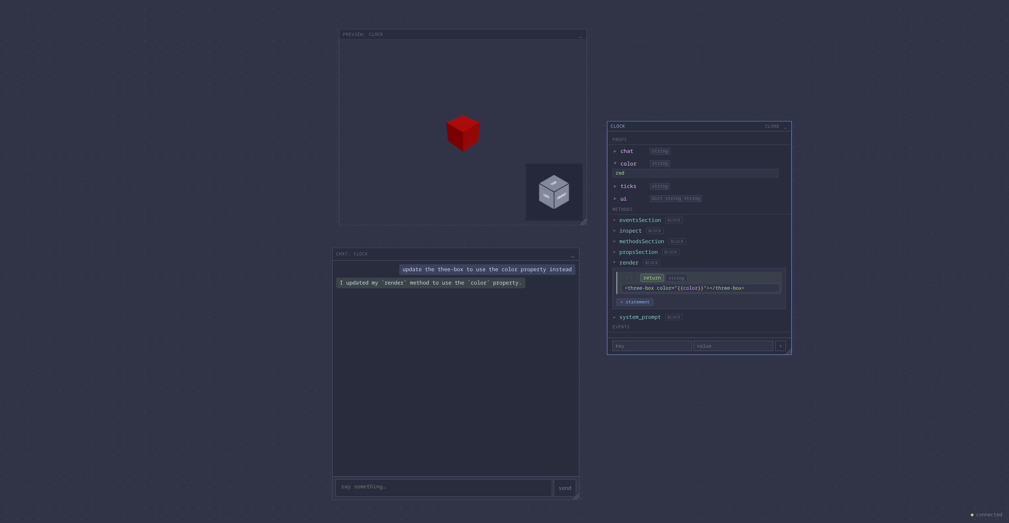 Every object has a chat. Tell it “make yourself red” and it updates its own color. Tell it “count faster” and it rewrites its own timer. Tell it “explain yourself” and it describes what it does in plain English.
